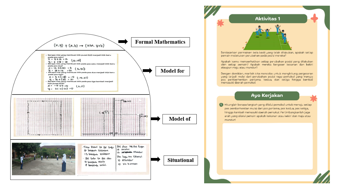 Students often struggle to grasp geometric transformation concepts, particularly translation. Although some students can recognize object movement visually, conceptual misconceptions persist in interpreting the meaning of displacement, along with difficulties in representing movement visually using Cartesian diagrams. This condition indicates the need for a more contextually and meaningfully grounded learning approach that connects mathematical concepts with activities familiar to students. In this study, the traditional game of bola kasti is employed as an effective learning medium, serving as a cultural activity that is relevant and closely related to students’ experiences. The traditional bola kasti game functions not merely as a contextual illustration but is systematically designed as a conceptual transition tool that bridges physical activities and formal coordinate representations in the concept of translation. This research aims to develop a learning trajectory using the PMRI approach, incorporating the context of the bola kasti game to support students in constructing a deep understanding of the concept of translation. The research employed a design research methodology with a validation study type, involving 32 ninth-grade students from SMP Negeri 52 Palembang. Data collection techniques included student activity sheets, classroom observations, and interviews, which were analyzed descriptively using a qualitative approach. The findings indicate that the Actual Learning Trajectory (ALT) aligns with the designed Hypothetical Learning Trajectory (HLT). Therefore, the developed HLT is considered successful and contributes to the development of a Local Instructional Theory (LIT) in enhancing students’ conceptual understanding progressively, as demonstrated by students’ ability to identify the direction and magnitude of translation and to represent translations using Cartesian diagrams through the PMRI approach with the context of the bola kasti game in translation learning.