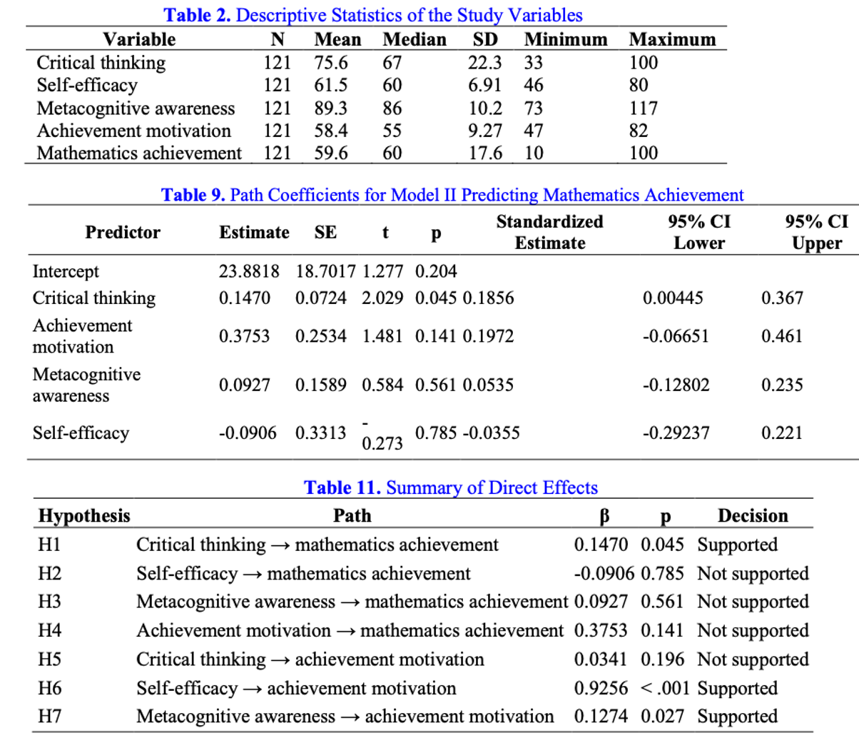 Determinants of Students’ Mathematics Achievement: The Roles of Critical Thinking, Self-Efficacy, and Metacognitive Awareness Through Achievement Motivation